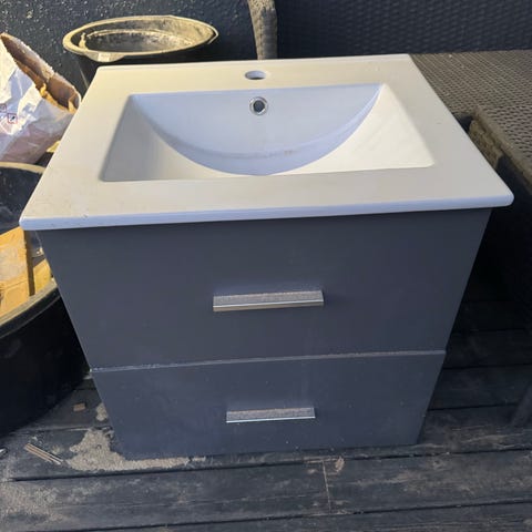 Baderomsinnredning med integrert servant og speil. 140cm bred, ca 50cm dyp. Innredningen har en hvit benkeplate med rektangulær, nedfelt servant og ettgreps blandebatteri. Underdelen har mørkt brun skrog med skuffer for oppbevaring. Speilet er rektangulært og har integrert belysning på sidene. Passer til montering på bad der det er behov for kombinert servantløsning og oppbevaringsplass.