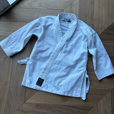 Green Hill Ippon Junior judo-/kampsportdrakt for barn i størrelse 130. Drakten består av jakke og bukse i hvit farge, med tilhørende belte. Passer til kampsporttrening som judo og lignende disipliner for barn rundt størrelse 122/128/134. Materialet er et robust stoff som er vanlig for kampsportdrakter, med forsterkede sømmer på utsatte områder. Egnet til bruk i trening og eventuelle nybegynnerpartier i kampsport for barn.