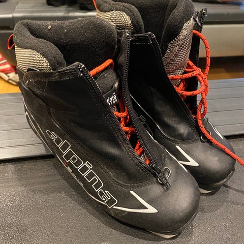 Alpina skisko til barn i størrelse 26. Brukt en sesong av ett barn. Uten skader eller bruksmerker av betydning.
