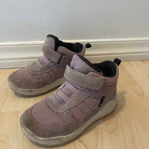 Viking barnesko med Gore-Tex-membran i størrelse 22 for unisex. Skoene er ankelhøye med to borrelåsstropper for enkel justering og av- og påtaking. Overdelen er i tekstil og syntetisk materiale i lilla farge, med polstret kant og hælhempe. Yttersålen er i gummi med mønster for grep. Gore-Tex-membranen er laget for å gi vanntett og pustende funksjon, egnet til hverdagsbruk og utelek i variert vær.