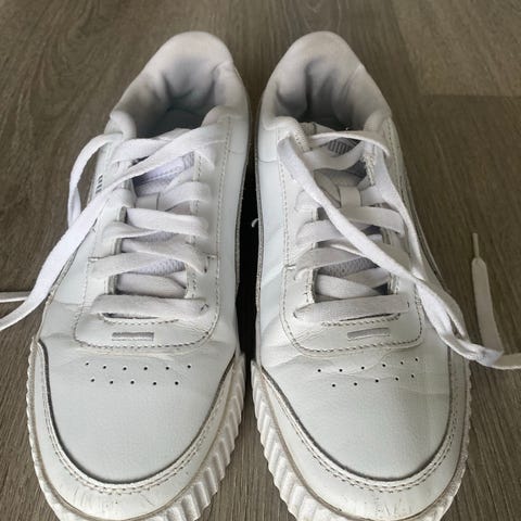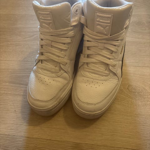 Puma sneakers i størrelse 39. Modellen er lave joggesko med snøring. Skoene er hvite med Puma-logo på siden og hælen. Overdelen er i syntetisk materiale med tekstilfôr, og sålen er i gummi med mønster for bedre grep. Passer som hverdagssko eller til lett aktivitet.