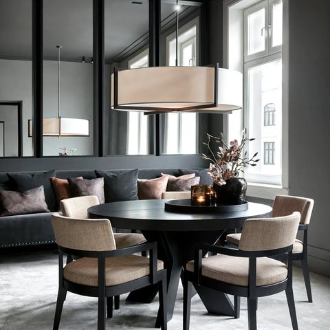Artwood taklampe med rund tekstilskjerm i beige farge. Lampen har trommeformet skjerm som gir et jevnt og diffust lys nedover og til sidene. Passer over spisebord, i stue eller andre oppholdsrom der man ønsker generell belysning. Designet er enkelt og nøytralt, slik at lampen kan kombineres med ulike interiørstiler.