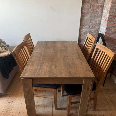 Pent brukt solid spisebord med 6 stoler og 2 ileggsplater på 50 cm x 2.