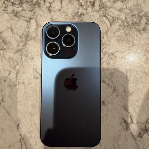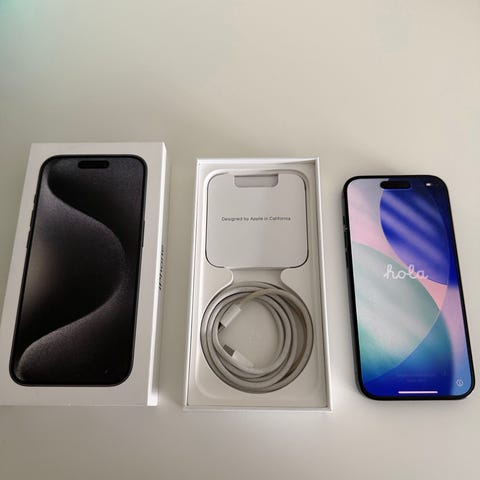 Apple iPhone 15 Pro smarttelefon med 128 GB lagringsplass. Modellen har trippelt kamerasystem på baksiden og skjerm som dekker nesten hele fronten.