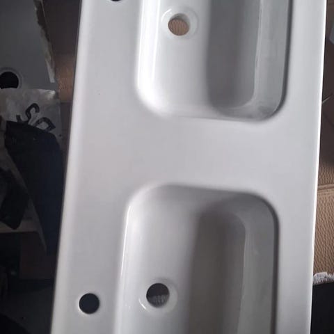 Bordmonterte baderomsvasker i hvit porselen. Vaskene er toppmonterte og har rette, moderne linjer med flat kant rundt. Passer til montering på baderomsbenk eller servantskap. Egnet for bruk på bad eller toalettrom der man ønsker en enkel og funksjonell servantløsning.