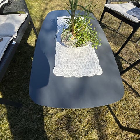Hvitt hagebord i aluminium. Rektangulær form med rette ben og bordplate med jevn overflate. Passer som lavt bord eller sofabord på terrasse, balkong eller i hage. Materialet er lett og egner seg for utendørs bruk.