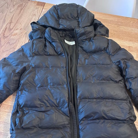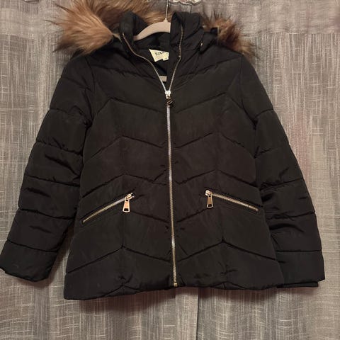 KappAhl jakke for jente i størrelse 140. Jakken er svart og laget i polyamid. Den har hette med fuskepelskant, glidelås og knappelukking foran, samt sidelommer. Ytterstoffet er glatt, og innsiden har fôr for økt komfort. Egnet som ytterjakke til hverdagsbruk i kjøligere vær.