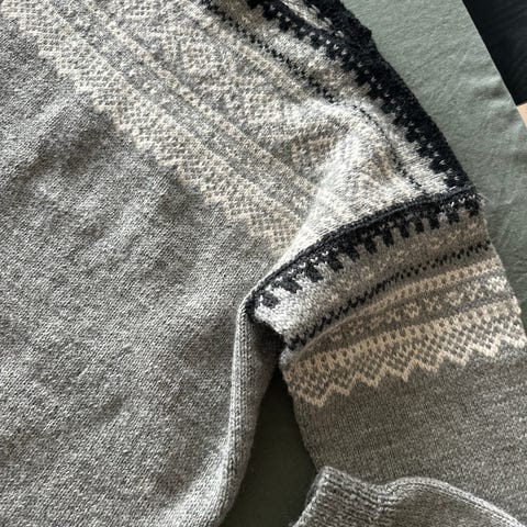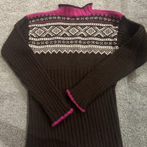 Akuratt ferdig med å strikke Mariusgenser, men den ble litt for trang rundt magen min. Selges til noen andre som ønsker en fin og varm genser. Noen skjønnhets feil kan forekomme da dette er hjemme strikk. Har lov til å strikke og selge Marius produkter.