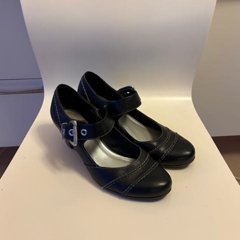 Skoene er vintage, men fremstår som pent og lite brukt – minimalt med slitasje på sålene (se bilder). De har en behagelig, lav hæl som gjør dem gode å gå i gjennom hele dagen.