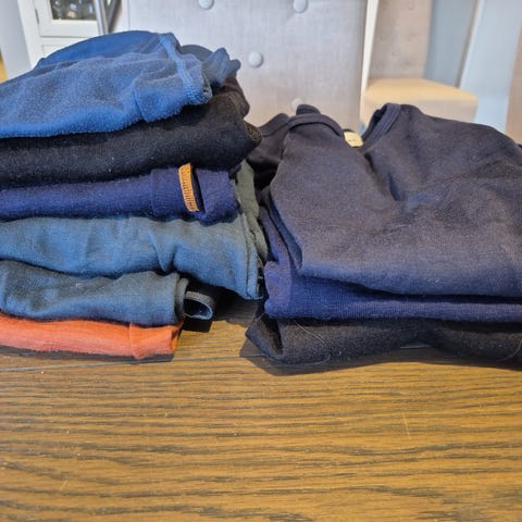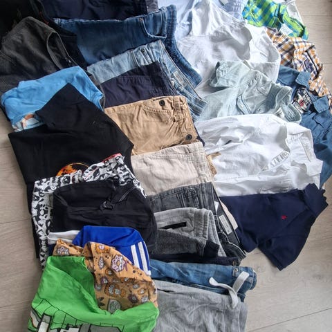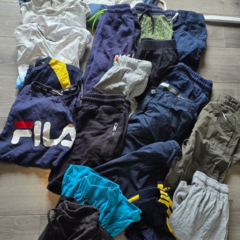 1 cord fløyel bukse, 2 shorts, 2 fleece gensere ,1 fleece bukse, 1 hettegenser, 1 ull- undertøyet, 1 vest, 1 strikket genser med zip, 1 t-skjorte, 1 penere genser. Pent og helt. Passer til gutter 8-9 år.