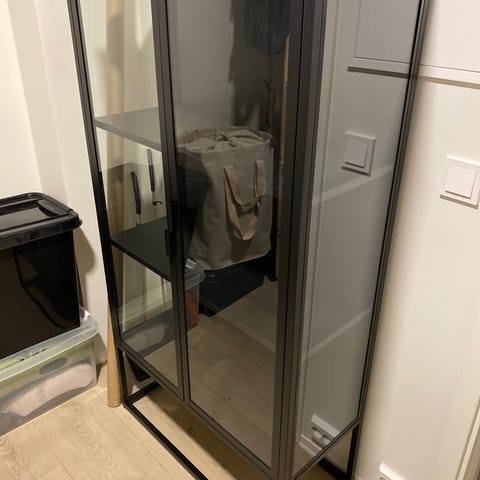 Vitrine med 4 glasshyller og en skuff. Behøver en vask etter oppbevaring