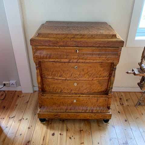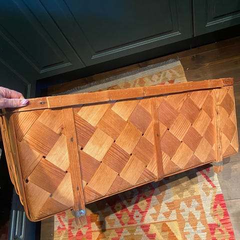 Kiste i tre med buet lokk og brun/orange overflate. Kisten har bærehåndtak på sidene og en enkel innvendig løsning uten inndelinger. Overflaten har et mønster i treverket som gir et særpreget uttrykk.