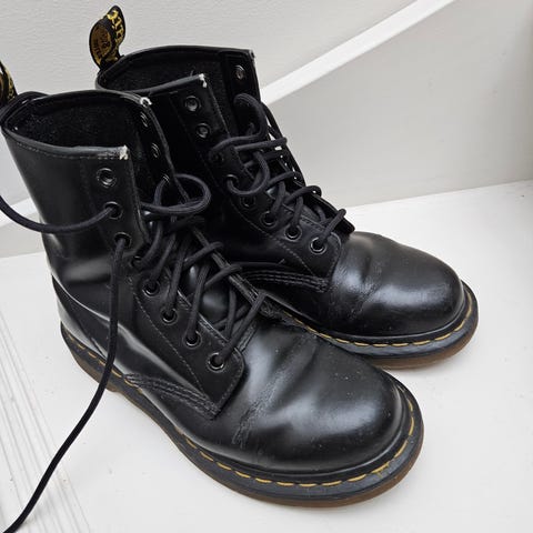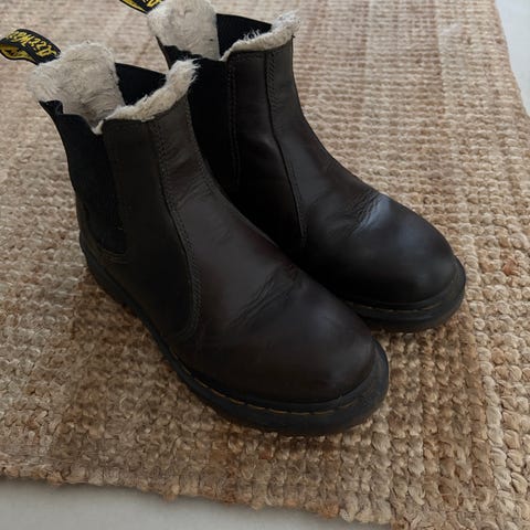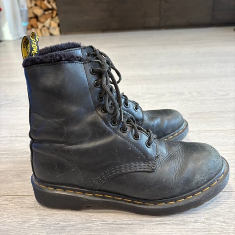 Klassiske Dr. Martens Serena støvler i størrelse 38. Støvlene er i svart skinn med snøring foran og karakteristisk hempe bak. Sålen er kraftig og sydd med synlig søm rundt. Innvendig har de fôr som gir ekstra komfort og varme. Egner seg til hverdagsbruk og utebruk i kjøligere vær.