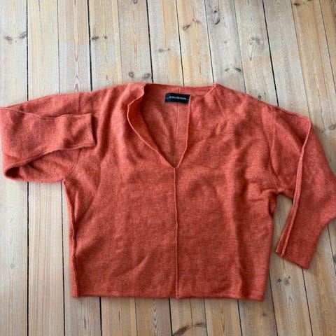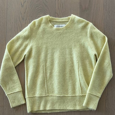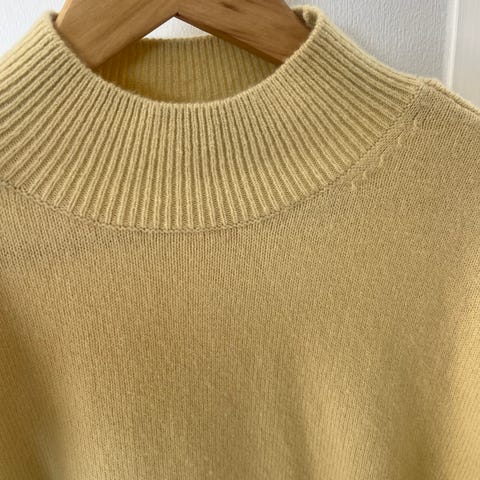 By Malene Birger genser for dame i størrelse M. Genseren er gul og strikket i en ullblanding med høy hals og ribbestruktur på kantene. Passformen er løs med vide ermer, egnet til bruk i hverdagen eller som et lag over andre plagg i kjøligere vær.