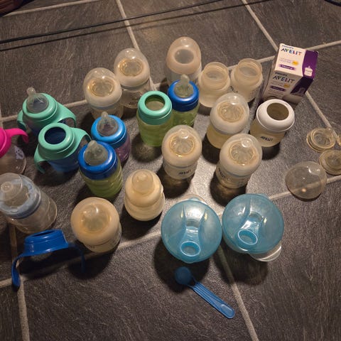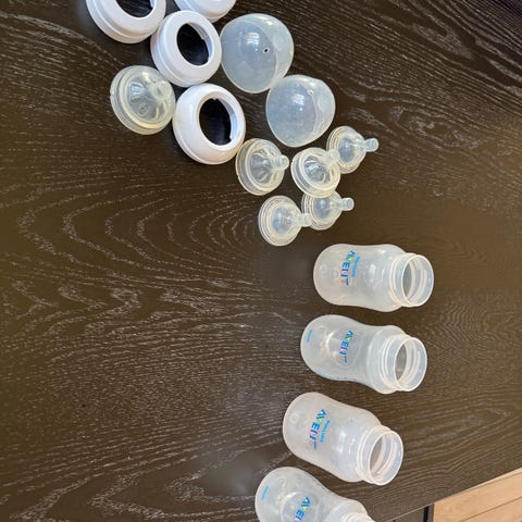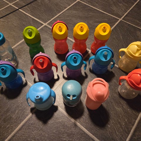Avent flasker til nyfødt og en flaske som er større. Også to drikkeflasker der toppen mangler