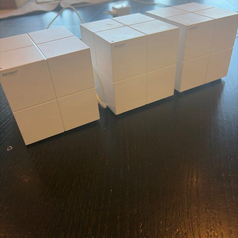 Jensen Omni mesh wifi-system i hvit farge. Systemet består av flere noder som sammen gir trådløst nettverk i boligen. Enhetene kobles til eksisterende ruter og fordeler wifi-dekningen jevnt i hjemmet. Egnet for bruk i bolig der det er behov for stabilt trådløst nettverk i flere rom eller etasjer. Leveres med strømledninger og plasseres fritt i huset for best mulig dekning.