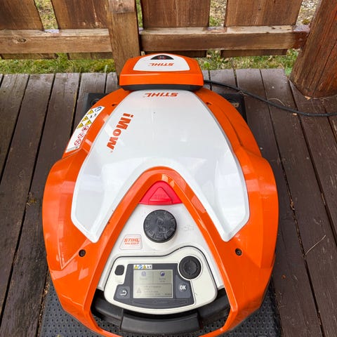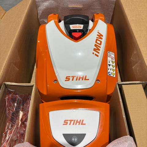 Stihl iMow robotklipper i grønn farge. Robotklipperen leveres med ladestasjon og strømkabel, slik det fremgår av bildene.