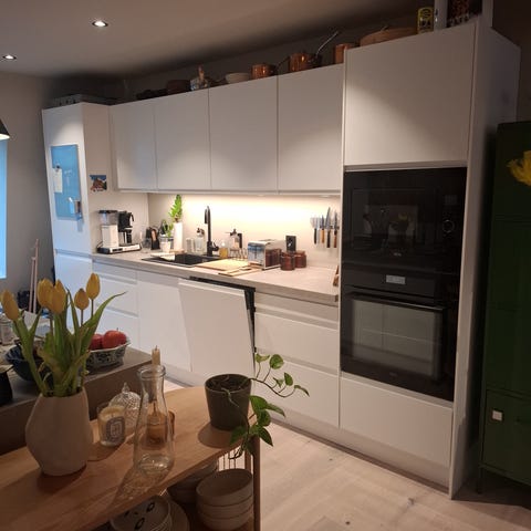 Innholdsrikt kjøkken selges. Alle skuffer og karuseller fungerer godt. Naturlig nok noe generell slitasje, og noen benkeskap har synlige skader. Benkeplaten er i heltre eik, og satt inn med osmo hardvoksolje, men trenger ny behandling. Kjøleskap og stekeovn medfølger ikke. Eldre mikro, platetopp og ventilator kan medfølge om ønskelig. Nyere frittstående oppvaskmaskin kan også medfølge. Høyskapet er egentlig ment å romme både mikro og stekeovn, men vi har flyttet stekeovnen pga konflikt med kjøleskapet, og derfor litt halvveis passform med skuffene som egentlig tilhører under platetopp. Kjøkkenet må demonteres og hentes av kjøper helga uke 17, dvs 25./26. april.