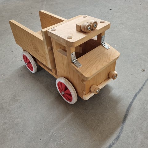 Gammel lastebil i rød farge. Lastebilen er laget i tre med en åpen lasteplan bak og førerhus foran. Hjulene er festet med gjennomgående aksel. Egner seg som lekebil for barn eller som dekorasjon på barnerom. Hjulene er av tre. Ratt i førerhuset(ikke mulig å styre) og 2 "lys" på fronten.