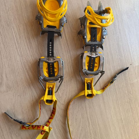 Stegjern i rødt og svart med remfeste. Justerbar lengde med hullrekke i midtskinnen for tilpasning til ulike skostørrelser. Metallpigger foran og bak gir feste på is og hard snø. Leveres med remmer for feste rundt sko eller støvler. Egnet til bruk på isete underlag, snøfelt og enkle bre- eller vinterturer der ekstra fotfeste er nødvendig.