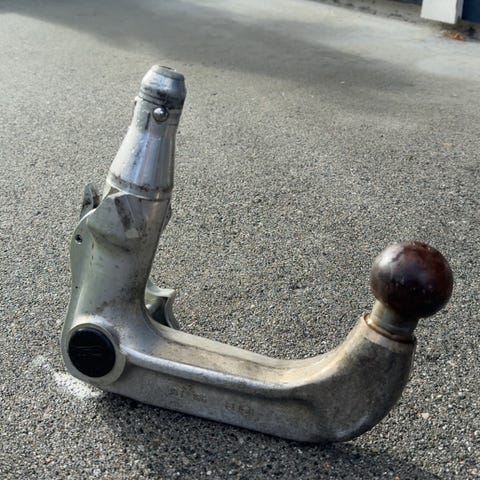 Avtagbar hengerkrok til bil i svart metall. Kroken har buet utforming med kulefeste i enden og låsemekanisme på toppen. Egnet som reservedel eller erstatning for eksisterende hengerfeste, for bruk sammen med kompatibelt feste på bilen. Passer til bil med tilhørende festeinnsats for avtagbar krok. Merke og modell er ikke angitt. Med en nøkkel.