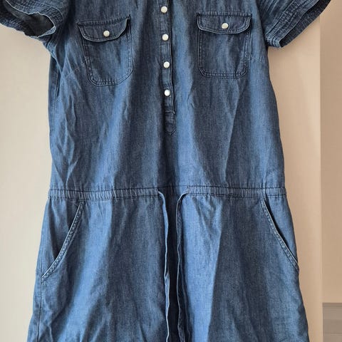 Kjolen er blå og har kort erm, V-utringning med knappestolpe og store påsydde lommer foran. Lengden går omtrent til kneet, med lett avrundet kant nederst bak. Passer som en enkel hverdagskjole i mykt bomullsstoff.
