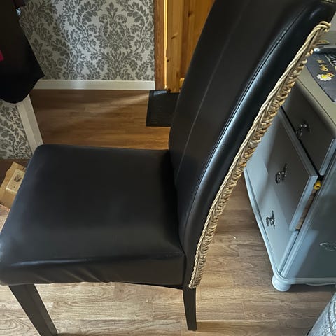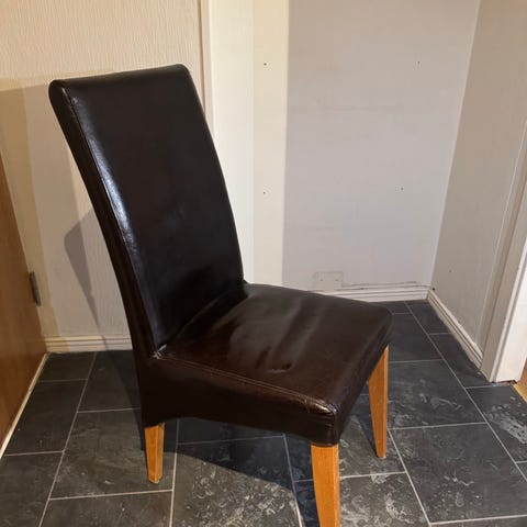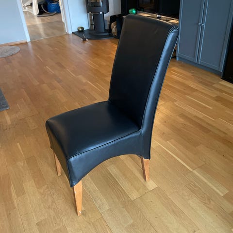 1000kr for alle 10 stk . 10 stk Spisestoler i kunstskinn, selges samlet. Litt knirk i ett par og en er litt slitt på siden. Må hentes.