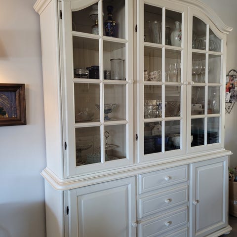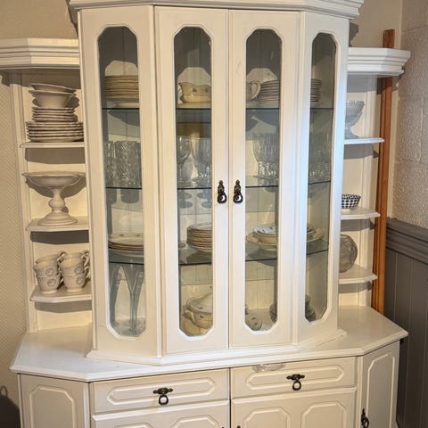 Flott hvit (bomull) vitrineskap i eik selges billig.