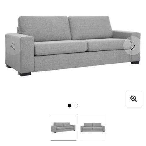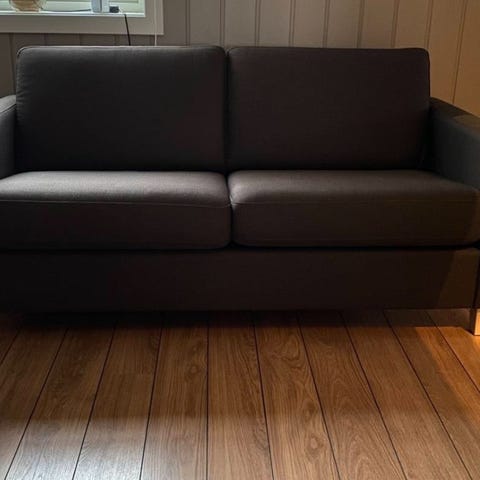 Gir bort sofa som er godt brukt, men er i god stand. Stoffet er solbleket noen steder. Stått på et ungdomsrom. Følger med puff og en liten pute. Mørke ben.