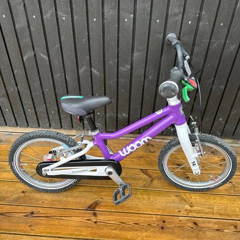 Pent brukt Woom barnesykkel med 14" hjul i lilla farge. Sykkelen har lav innstegshøyde og lett ramme som gjør den egnet for mindre barn som skal lære å sykle.