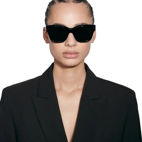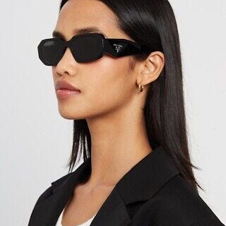 Prada solbriller som passer både til dame og herre, med rektangulære glass og brun, mønstrete (tortoise) plastinnfatning. Solbrillene har hel innfatning rundt glassene og tydelig Prada-logo på brillestengene. En veldig fin brikke som passer til alt!