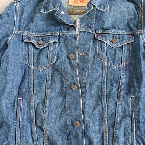 Levi's denimjakke for herre i størrelse L, farge mørk blå. Jakken er laget i denim og har klassisk jeansjakkesnitt med krage, knappelukking foran og brystlommer med klaff og knapp.
