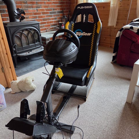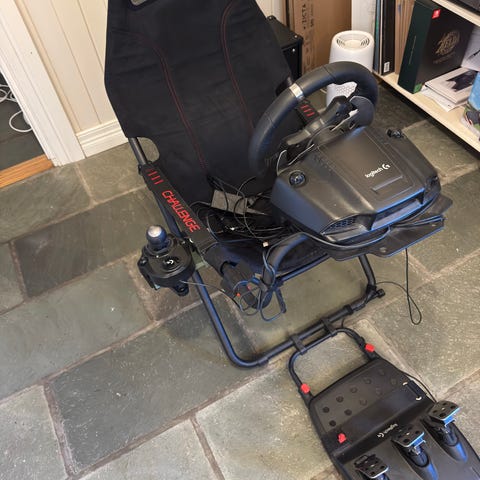 Playseat racingsete med Logitech ratt, pedaler og girspak.