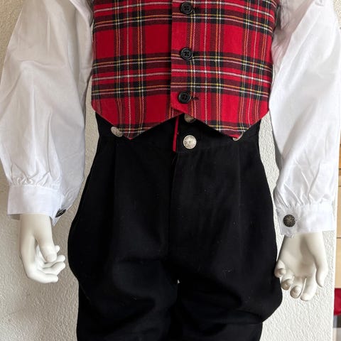 Brukt til 2 gutter, og eneste anmerkning jeg kan se er at den er litt gulnet på skjorten (se bilde) også mangler det en knapp på buksen.