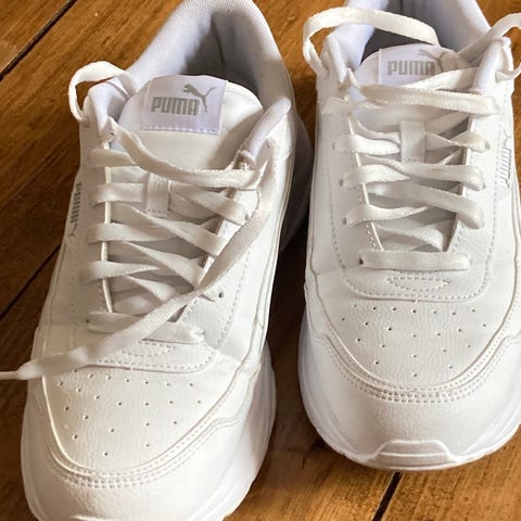 Puma sneakers i størrelse 42 selges da de ikke ble brukt. Kjøpt i fjor men aldri tatt i bruk. De har litt misfarge på sålen under skoen fra de ble prøvd, og noe kattehår inni skoen pga at vi har katt. Men utseende messig fremstår de som nye. Den ene er ikke engang knytt opp den skolisse løkka som kommer fra butikk. Som sagt aldri brukt, bare prøvd.