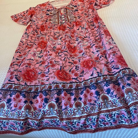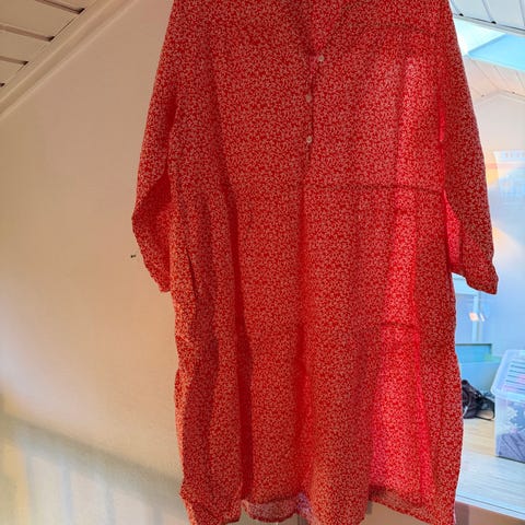 Marta sommerkjole for dame i størrelse M. Kjolen er rosa med trykket mønster i kontrastfarger og har løs, rett passform. Den er laget i viskose og har v-utringning og lange ermer som kan brettes opp. Lengden går omtrent til leggen, egnet som sommerkjole eller lett strandkjole.
