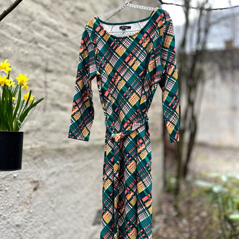 Lite brukt. Vil si den er mer L enn XL. Belte medfølger. Viskose og elastan