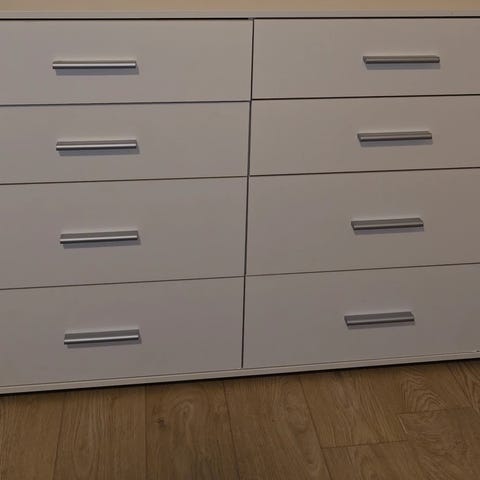 Selger en stilren og praktisk IKEA kommode med 6 skuffer i hvit farge. Kommoden er pent brukt og i god stand, og alle skuffer fungerer som de skal. Perfekt for oppbevaring i soverom, stue eller gang.