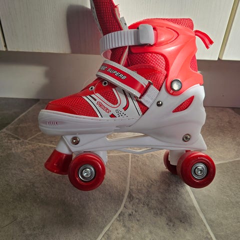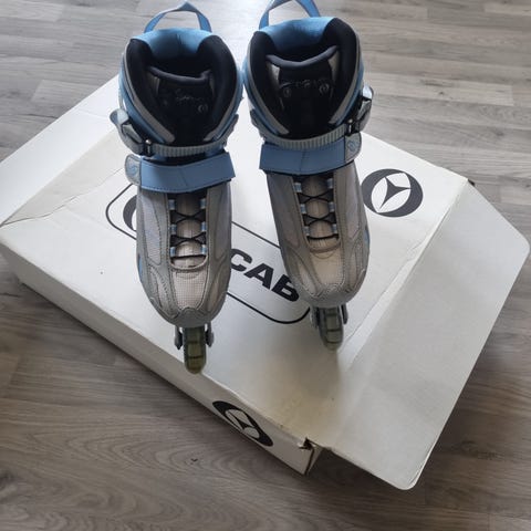 Rollerblade rulleskøyter i størrelse 39. Modellen har hard yttersko med justerbare spenner og lisser for god støtte rundt ankel og fot. Skøytene har fire hjul per skøyte med aluminiumsramme og bremsekloss bak på den ene skøyten. Fargekombinasjon svart med røde og grå detaljer. Egnet til rekreasjonsbruk på asfalt og andre jevne underlag.