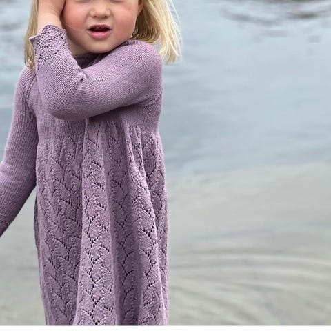 Flott håndstrikket kjole i str 5-6 år . Strikket i baby bomull , fin til våren og sommeren .