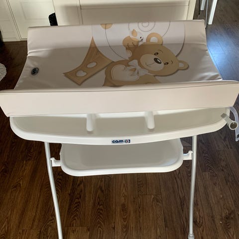 Selger et praktisk og plassbesparende stellebord med innebygd badekar. Perfekt for mindre baderom eller som en ekstra løsning som enkelt kan stues bort.