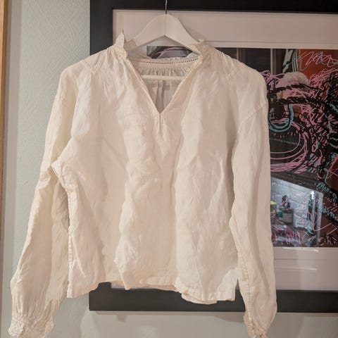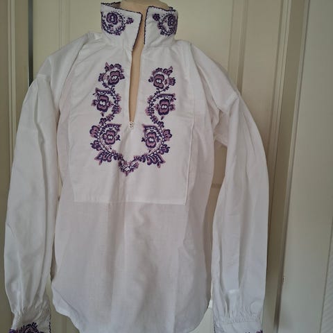 Hel og pen bunadskjorte til beltestakk. Hvit linskjorte med broderi på bryst, håndledd og hals.