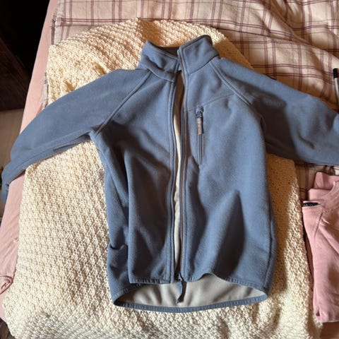 Polarn O. Pyret fleecejakke for barn i størrelse 128, unisexmodell. Jakken er blå og laget i myk vindfleece. Den har høy krage og glidelås i front. På brystet er det en glidelåslomme. Ermene har ribbekanter. Jakken egner seg som mellomlag under yttertøy eller som lett jakke inne og ute i mildere vær. Er vindtett.