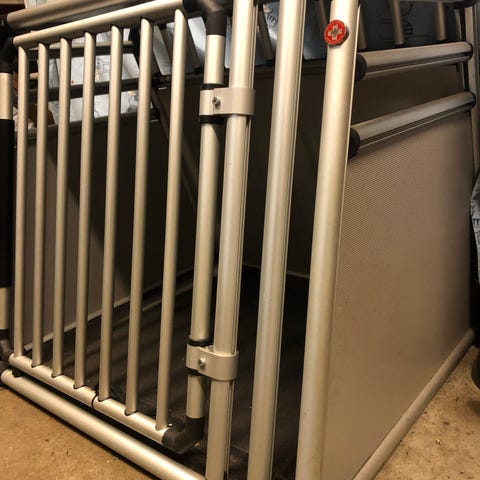 Buret har gitterdør i front og skrå bakside som er tilpasset plassering i bilbagasjerom.