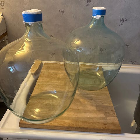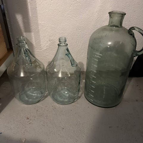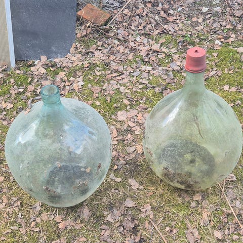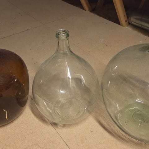 Glassballong i grønt og hvit glass. Egner seg blant annet til lagring eller gjæring av drikke og andre væsker. Formen er rund med smal hals. Kan brukes som funksjonell beholder eller som dekorasjon