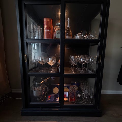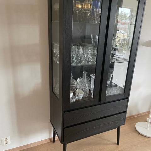 Sort Vitrineskap selges. Grå innvendig 210 høy, 134 bred, 38 dyp. Må hentes