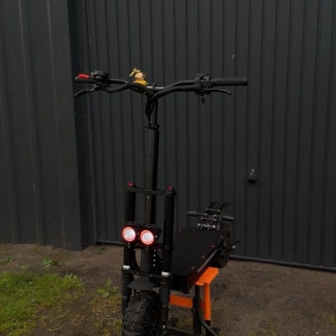 Går 30 km/t, men det følger med eit annet display som gjør at den går i 50km/t. Litt slitte dekk. Sykkelen er jo ikkje ny lenger, så det er litt slakk i lenkearmen til bakdemper.