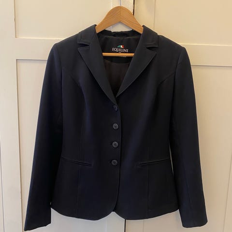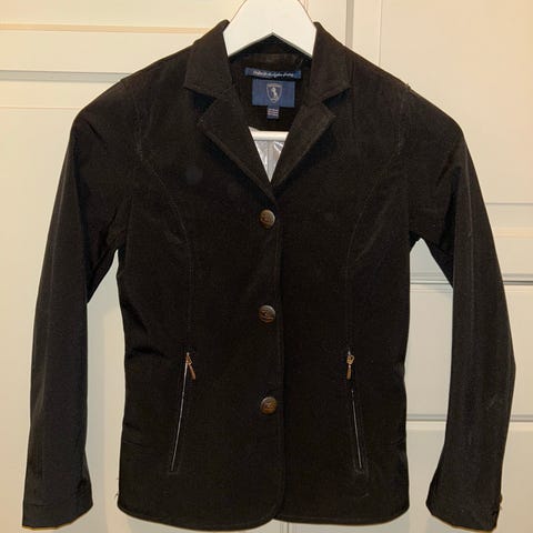 Horze stevnejakke str 134/140. Jakken er svart og har klassisk krage, tre knapper i front og glidelåslommer. Innvendig delvis fôret for bedre komfort. Egnet som stevnejakke eller til ridning og trening.