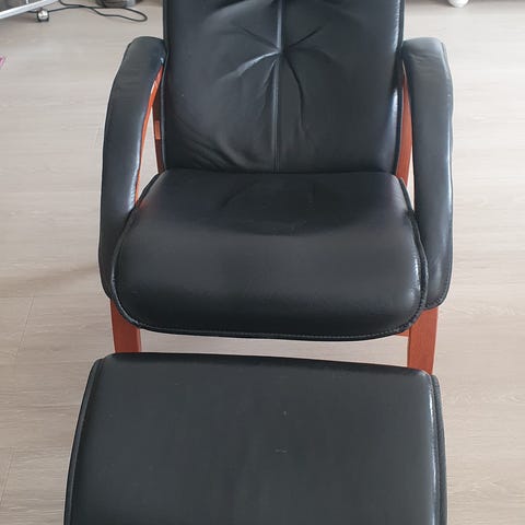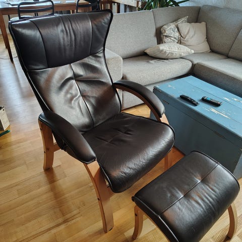 GJØR ET KUPP. Elegant lenestol fra Brunstad mørk brunt skinn med krakk. Treverket er i hvitoljet eik. Stolen har innebygget glidefunksjon og aktiv nakkestøtte. Unik sittekomfort.