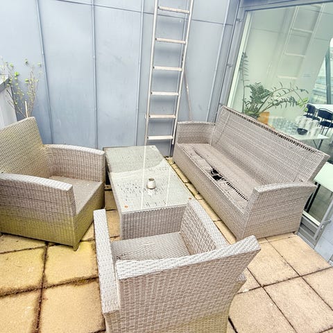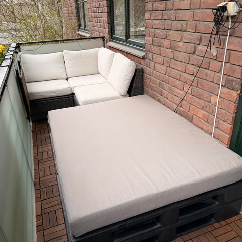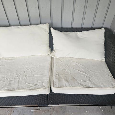 Modulsofa utemøbler i grå kunstrotting. Består av flere moduler som kan settes sammen til ønsket sittegruppe. Det kommer med puter men de har blitt veldig stygge men kan fåes med